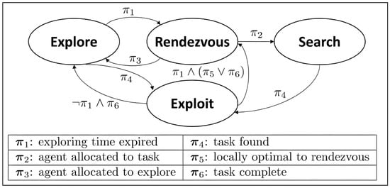 - Bramblett, L.; Peddi, R.; Bezzo, N. Coordinated Multi-Agent Exploration, Rendezvous, & Task Allocation in Unknown Environments with Limited Connectivity. In Proceedings of the 2022 IEEE/RSJ International Conference on Intelligent Robots and Systems (IROS), Kyoto, Japan, 23–27 October 2022; pp. 12706–12712. [Google Scholar] [CrossRef]