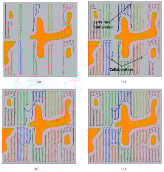 Kalde et al. [45] considered the problem of exploring an unknown environment with wheeled robots. The authors’ approach to this problem is frontier-based iterative planning with human guidance. At each planning interval, the environment is first decomposed by identifying tasks as either frontier tasks or human tasks. In this work, humans can assist robots in navigation by leading them. The approach makes use of a parametric heuristic to equilibrate the frontier tasks and the human tasks. This parametric heuristic takes the form of a “mixed cost model”, where a cost value is computed for each agent–task assignment in a cost matrix. The cost function is formed from two components. The distance component is simply the distance for the robot to traverse to a task. The penalty component is composed of a time penalty and an orientation penalty, the time penalty being the time elapsed since the frontier’s discovery and the orientation being the smallest angle between the robot’s orientation and the direction of the frontier or orientation of the human. Given the cost matrix, two greedy approaches were used—one fully decentralised and one locally coordinated.