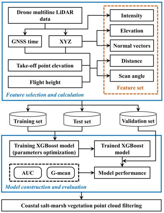In addition to the traditional filtering methods based on either geometric or intensity data, another new potential strategy is machine-learning-based methods, e.g., adaptive boosting (AdaBoost), extreme gradient boosting (XGBoost), and random forest (RF) []. Machine-learning-based methods can automate feature learning, handle high-dimensional data, and deal with nonlinear relationships, which are suitable for various scenarios and different filtering tasks []. In particular, the XGBoost can efficiently process massive data samples through noncore computation, which demonstrates superior classification performance and effectiveness compared to other commonly used machine-learning methods and shows great potential in 3D point-cloud processing []. However, the performance of the XGBoost for filtering salt-marsh vegetation remains unknown, since the scanning mode of drone multiline LiDAR is totally different from the traditional LiDAR; the salt-marsh environment is extremely complicated.