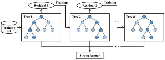 XGBoost improves classification accuracy by building an ensemble of multiple weak classifiers []. The fundamental principle of XGBoost is to fit the residuals by continuously iterating and to update the model parameters by optimizing the objective function (Figure 2).