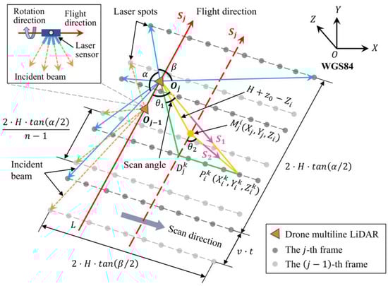 According to the scanning principles of drone multiline LiDAR, the emitters are rotated and scanned at a fixed angle step around the drone flight direction line in each frame (Figure 3). Therefore, the included angles between each individual incident beam and the drone flight direction line are equal for each point in a certain scan line, i.e., . Thus, . In (Figure 3), the following relationships can be obtained.