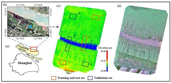 The species and densities of the vegetation and the salt-marsh topography can influence the filtering accuracy and reliability. In this study, three representative subregions (orange boxes in Figure 4c) with varying vegetation and topographic characteristics (Table 1) from the study site were selected to build a generalized XGBoost model. The compositions of the point clouds of the three regions were randomly divided into two subsets according to a 7:3 ratio. Specifically, 70% of the point clouds served as the training set for model training, and 30% of the point clouds acted as the test set for model-performance evaluation. The XGBoost model training includes a number of hyperparameter settings, among which the main parameters include n_estimators, lambda, gamma, colsample_bytree, learning_rate, max_depth, subsample, and min_child_weight. The hyperparameters were optimized by a grid search method which is widely used for machine-learning hyperparameter optimization. The best parameters of the XGBoost model were obtained when the highest accuracy was achieved on the test set. Merely observing the accuracy performance of the test set cannot demonstrate the generalization ability of the constructed XGBoost model. Therefore, we selected three additional regions with different vegetation and topographic characteristics (Table 1) from the study site (blue boxes in Figure 4c) as the validation set to further test the constructed model. The XGBoost model was trained, tested, and validated using the Scikit-learn library in Python in this study. The reference data for model evaluation were gathered manually, aided by the orthophotos to guarantee precision.