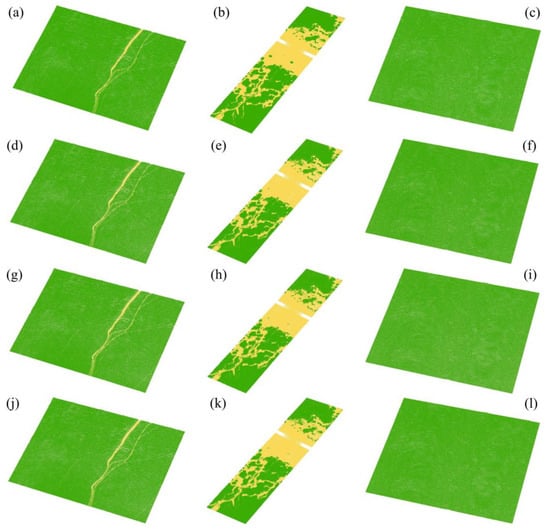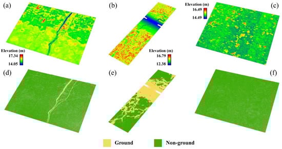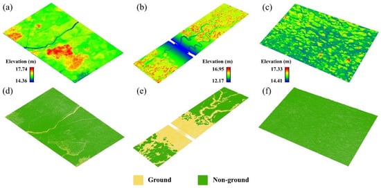 The results in Section 3.2 and Section 3.3 indicated the satisfactory performance of the XGBoost model in filtering salt-marsh vegetation. Therefore, the trained XGBoost model was applied to the entire study site (Figure 7a,i). A total of 25,740,656 and 217,357,732 points were identified as ground and vegetation. The ground points were sparse and only accounted for 11% of the total points. It can be observed that the various types of salt-marsh vegetation points were effectively separated, while the ground points in the bare mudflat areas were completely preserved. The distribution and orientation of the tidal creeks were easily discernible. Additionally, it can be observed from Figure 7i that the acquired ground points are denser at the nadir regions, i.e., strip effects existed in the ground points. The strip effects were due to the normal incidence at nadir regions, making a better penetration performance for the lasers within the dense vegetation.