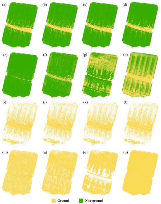 Separating results of the entire study site. (a–h): Ground and nonground/vegetation points acquired by XGBoost, AdaBoost, RF, Catboost, PMF, SF, CSF, and, CIF, respectively. (i–p): Ground points acquired by XGBoost, AdaBoost, RF, Catboost, PMF, SF, CSF, and CIF, respectively. The ground/vegetation points after separating are 25,740,656/217,357,732, 25,757,205/217,341,183, 24,983,927/218,114,461, 25,675,001/217,423,387, 51,229,362/191,869,026, 9,8575,115/144,523,273, 141,987,475/101,110,913, and 130,563,383/112,535,005 for XGBoost, AdaBoost, RF, Catboost, PMF, SF, CSF, and CIF, respectively.
