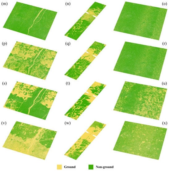 Separating results comparison of different point-cloud filtering methods on the validation set. (a–c) Manual. (d–f) RF. (g–i) AdaBoost. (j–l) CatBoost. (m–o) PMF. (p–r) SF. (s–u) CSF. (v–x) CIF.