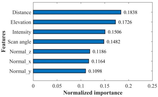 Selecting appropriate features for XGBoost can improve model performance and accuracy while reducing computational complexity and overfitting risk []. In the proposed method, the intensity, incidence angle, distance, elevation, and normal vectors are used as input features to build an XGBoost filtering model. Intensity demonstrates the reflectance of the target surface and can discriminate different types of objects. The incidence angle and distance are the predominant factors that affect intensity. By imputing intensity, distance, and scan angle as features in the XGBoost model, the influences of scan geometry on intensity can be fully eliminated and the traditionally complex intensity-correction processes are avoided. However, only the single-wavelength intensity data are not able to separate all vegetation points. The orientations of the vegetation points are irregular, whereas those of the ground points are nearly perpendicular. Additionally, the vegetation is generally higher than the mudflat. As such, the normal vectors and elevation (i.e., the coordinate), which indicate the surface orientation and height of each point, respectively, are used to compensate for the insufficiency of the intensity data.