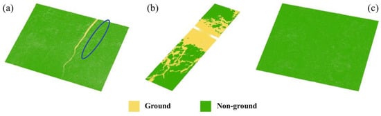 A “hummingbird” genius multiline LiDAR, equipped with an R-Fans-16 laser scanner capable of simultaneously emitting 16 laser beams, was mounted on the “ZR-M66” drone platform to collect the point clouds of the selected salt marsh on 17 August 2019. The wavelength and maximum scanning distance of the emitted laser are 905 nm (near-infrared) and 250 m, respectively. The field of view of the R-Fans-16 laser scanner is 360° × 30°. The pulse repetition frequency is 320 kHz, and the scanning frequency is 5–20 Hz (5 Hz in this study). The R-Fans-16 laser scanner can receive multiple echoes, ensuring that it can better penetrate the salt-marsh vegetation and obtain high-precision ground data. The flight height during data collection was 80 m, whereas the drone moved at a uniform speed of 7 m/s. The obtained LAS-format data for each point were mainly constituted by the elements of 3D coordinates, GNSS time, and original intensity. The horizontal coordinates ( and ) and elevation () referred to the WGS84 coordinate system and geodetic height, respectively. The point-clouds preprocessing mainly included outliers and noises removal, which were accomplished by CloudCompare software. A total of 243,098,388 points were obtained for the study site, with overall horizontal and vertical accuracies of 0.10 and 0.15 m, respectively. The acquired point clouds were used to extract the fairy circles in []. In this study, the aim is to extract the vegetation points rather than the fairy circles. Additionally, an orthophoto of the study site was acquired by a Sony RX1R Ⅱ camera (Figure 4d). More detailed information on the study site and data collection materials can be referred to in [].