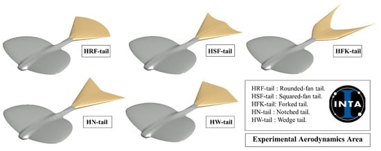 The Horizontal-Rounded-Fan stabilizer (HRF-tail) is inspired by a combination of rounded and fan-shaped tails; the Horizontal-Squared-Fan stabilizer (HSF-tail) is inspired by square and round shaped-tails; the Horizontal-Forked stabilizer (HFK-tail) is designed based on the forked shaped-tail; the Horizontal-Notched stabilizer (HN-tail) is basically the notched-shaped tail; and finally, the Horizontal-Wedge stabilizer (HW-tail) is similar to the wedge-shaped tail.