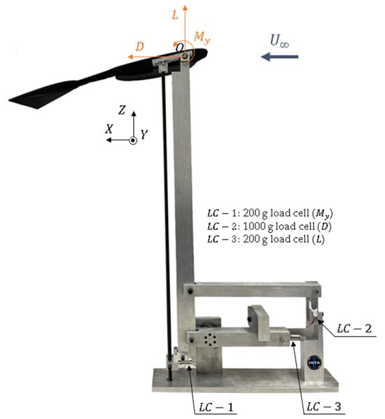 The external balance consists of a metallic structure that allows decoupling the forces to be measured. This is mainly composed of various mechanisms, including both hollow and solid metal rods, as well as other essential components necessary for the final assembly, such as locking or balancing elements (see Figure 4). The instrumentation is achieved by employing piezoresistive sensors, which consist of three bending load cells fixed to various mechanisms using bearings and bushings. In Figure 4, is the load cell with a 0–200 g measuring range placed horizontally to measure the pitching moment () is the load cell that measures the aerodynamic drag force (), it is placed vertically and with a measuring range between 0 and 1000 g; and finally, is the load cell that measures the lift force () and is placed horizontally with a 0–200 g measuring range. The forces and pitching moment are obtained along the balance axes (). The lift force () maintains the direction of the balance axis Z, the aerodynamic drag force () opposes the uniform velocity (), in the balance axis X, and the pitching moment () is obtained at the reference point along the balance axis Y.