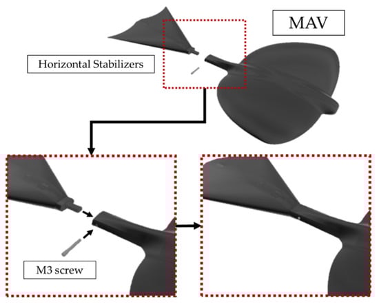 To facilitate the performance of wind tunnel tests, the MAV model is manufactured independently of each bioinspired horizontal stabilizer; therefore, the union of both is made with an M3 screw, as seen in Figure 5.