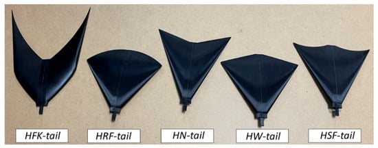 In this paper, five horizontal stabilizer configurations inspired by one or a combination of two bird tails are analyzed experimentally (see Figure 3). The preliminary design of each horizontal stabilizer configuration is detailed in a previous numerical work [22]. The selection of these configurations was conducted by focusing on the main types existing in nature (squared, forked, wedge, pointed, fan, notched, doubled, and rounded).