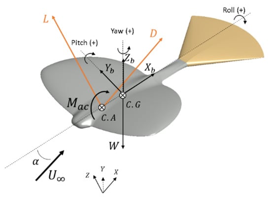 Figure 8 shows the forces acting on the MAV vehicle with the MAV axes () and balance axes ().