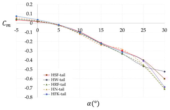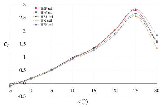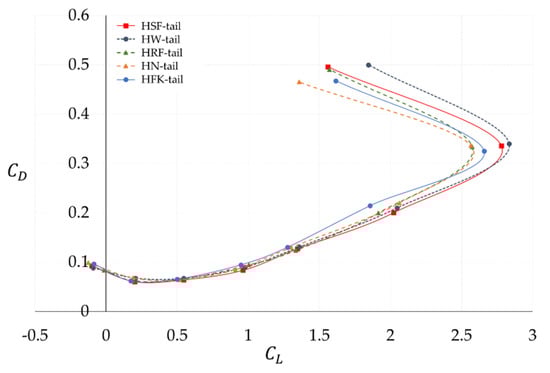 At low angles of attack (), the lift coefficient shows similar values between all horizontal stabilizers. However, when the angle of attack is higher (), a slight difference between them can be appreciated. The maximum value of is obtained for the Horizontal-Wedge-Shaped stabilizer (HW-tail), being higher than the Square-Fan-Shaped stabilizer (HSF-tail), being higher than the Forked-Shaped stabilizer (HFK-tail), higher than the Rounded-Fan-Shaped stabilizer (HRF-tail), and higher than the Notched-Shaped stabilizer (HN-tail).