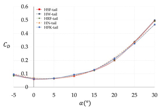 In all bioinspired horizontal stabilizers, the values of the aerodynamic drag coefficient () at all angles of attack are practically the same; only HFK and HN-tails show slight differences at very high angles of attack, around .