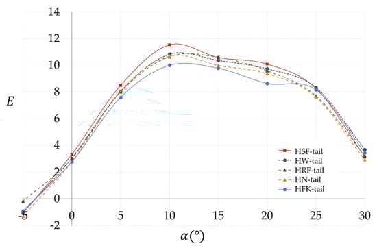 Figure 12 shows the aerodynamic efficiency () obtained for the five bioinspired horizontal stabilizers by force balance measurements in the wind tunnel.