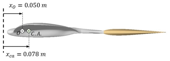 Figure 13 shows the pitching moment coefficient () obtained for the five bioinspired horizontal stabilizers by force balance measurements in the wind tunnel. These measurements are taken at the reference point , located at from the nose of the MAV (Figure 14). This is a fixed point joining the MAV and the external balance and is located near the aerodynamic center of the vehicle ().