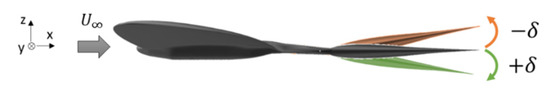 The horizontal stabilizer is tested at different angles of incidence, from , to , with an interval of . When the angle of incidence is negative, the stabilizer exhibits an upward deflection, whereas when it deflects downward, the angle of incidence is positive (see Figure 15). Within each angle of incidence, the entire range of angles of attack is studied.