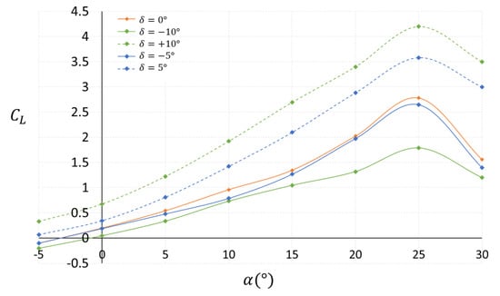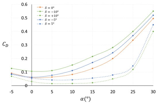 The aerodynamic drag variation due to horizontal stabilizer deflection will depend on the angle of attack, the orientation of the wing, and the flight conditions. In this context, it is observed how negative angles of incidence (upward deflection) result in an increased aerodynamic drag coefficient when compared to the zero angle of incidence (). In contrast, positive angles of incidence yield reduced values of aerodynamic drag over the entire range of angles of attack in comparison to the zero angle of incidence. The lowest aerodynamic drag coefficient is achieved when employing an angle of incidence of .