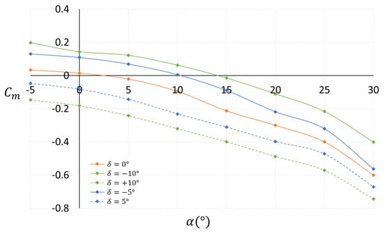 Figure 18 shows the pitching moment coefficient curve for all angles of incidence measured at the reference point . As in the previous cases, adjusting the horizontal stabilizer deflection leads to observable changes in the pitching moment coefficient. Deflection of the stabilizer should shift the pitching moment curve by adjusting the trim angle of attack (the angle of attack at which the pitching moment coefficient is zero) without substantially changing the pitching moment slope.