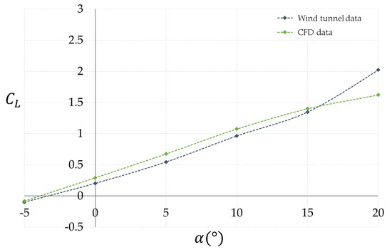Figure 19 shows the lift coefficient curves () for all angles of attack, except for those near the stall condition (). It is clearly observed that the values of lift coefficient obtained by both methods are fairly similar up to . The numerical values are slightly higher than those obtained with the external balance in the wind tunnel. It could be that the CFD numerical calculation is overestimating this coefficient due to the turbulence model selected (k-ω SST) or the lack of resolution in the 3D computational mesh. The maximum relative difference of is obtained at while the minimum relative difference of is obtained at α = 15°. It can be verified that there is high accuracy in the measurement of the lift coefficient when the angles of attack are less than .