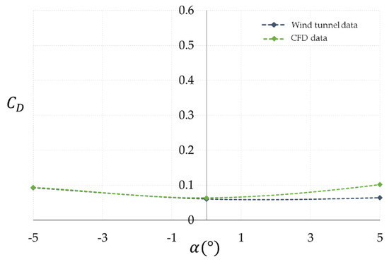 Figure 20 shows the aerodynamic drag coefficient curves () for low angles of attack (), as this research is mainly focused on the cruise condition. In this range of angles of attack, the relative difference of is obtained when the angle of attack is and the minimum relative difference is when .