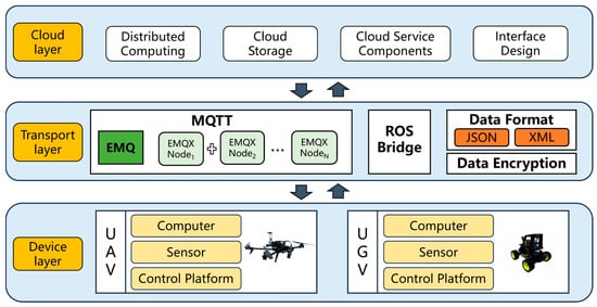 As shown in Figure 1, the overall architecture of IMUC consists of the following three layers: (i) Device layer, which includes connected hardware of multiple unmanned systems (such as unmanned vehicles, drones, etc.). Each unmanned device is equipped with a microcomputer (for real-time computing requirements and information exchange with the cloud), sensors (mounted on unmanned devices to collect spatial scene data, with different sensors used for different task scenarios), and a control platform (used to drive the motion of unmanned systems). (ii) Transmission layer, which facilitates efficient information transfer between the cloud layer and the device layer. This layer utilizes ROS Bridge and MQTT (Message Queuing Telemetry Transport) protocols, with JSON and XML being the main data formats. (iii) Cloud layer, which provides a range of services and components in a cloud computing environment. This includes distributed computing, cloud storage, cloud service components, and interface design. These components and services leverage the cloud platform to provide large-scale computing and storage capabilities, meeting the users’ requirements for high performance, scalability, and reliability.