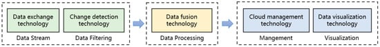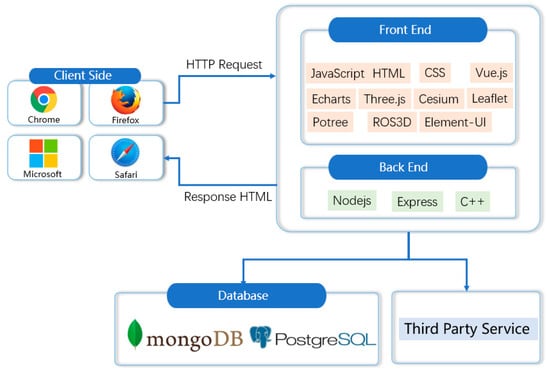 IMUC utilizes various technologies to build different components and implement various functionalities. As shown in Figure 2, on the frontend, we use JavaScript, HTML, and CSS as foundational technologies and employ Vue.js as the frontend framework to achieve dynamic user interfaces. Additionally, we utilize ElementUI as a UI design tool to provide aesthetically pleasing and user-friendly interface elements. On the server side, we adopt Node.js as the backend technology stack and use the Express framework to build server-side applications. This allows us to efficiently handle client requests and interact with databases and other services. To support data storage and management, we utilize both the NoSQL database MongoDB and the relational database PostgreSQL to meet the requirements of different types of data. For mapping functionalities, we use Leaflet as the mapping library and integrate it with TianDiTu and Cesium to provide map display and interaction features on the platform. Furthermore, we employ the Potree library for three-dimensional point cloud rendering, enabling visualization and analysis of point cloud data. Finally, to achieve real-time data transmission and communication, we employ a data transfer mechanism based on WebSocket technology. This approach ensures real-time data transfer and bidirectional communication between the client and the server, improving the platform’s responsiveness and real-time capabilities.