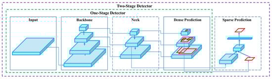 For the transmission of video data, we use Mjpg_Server at the edge layer to publish video streaming services and employ the ROSBridge protocol for data transmission. This allows for convenient transmission of real-time video streams captured by unmanned device cameras to the cloud platform, enabling remote monitoring and storage. Additionally, the video frames are embedded with object detection results that can identify pedestrians in the video. This means that users can access real-time video through this platform and accurately detect and recognize pedestrians in the video. The object detection algorithm used here is YOLOv4 (You Only Look Once version 4) [], which is an advanced object detection algorithm that has achieved significant improvements in accuracy and speed. The general framework of this object detector is shown in Figure 4. Finally, the platform supports displaying the received video stream data on the web client, allowing users to watch and monitor the video stream in real time through a web interface. In summary, users can access the platform through a web browser to obtain video data and object detection results from the unmanned device camera.