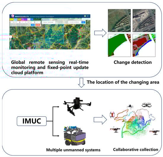 To address the issues of low efficiency, repetition, randomness, and untimeliness in data acquisition tasks in complex scenes, as shown in Figure 5, we integrated the Global Remote Sensing Real-time Monitoring and Point-to-Point Update Cloud Platform []. This platform can detect persistent changes in the task area and can push the location information of the changed areas to our platform. This allows our platform to promptly respond to real-time task requirements and take appropriate measures during execution to achieve the following goals:
