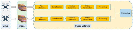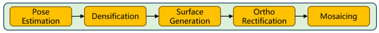 For the online image splicing part, we used the OpenREALM [] image splicing framework. The process of this framework is shown in Figure 6, which mainly includes five parts: Pose Estimation, Densification, Surface Generation, Ortho Rectification, and Mosaicing.