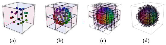 Spherical point cloud divided into MNO ((a) Level 0; (b) Level 1; (c) Level 2; (d) Level 3).