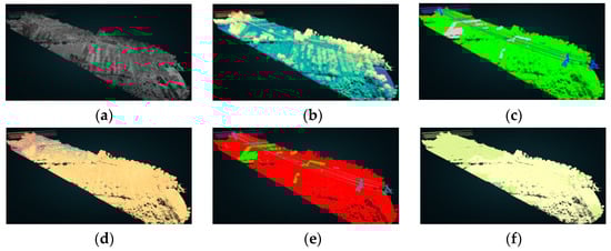 Transmission line point cloud rendering: (a) intensity coloring; (b) elevation coloring; (c) RGB coloring; (d) GPS time coloring; (e) classification coloring; (f) LOD level coloring.