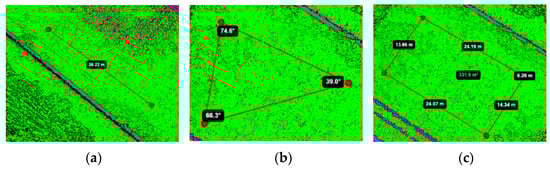 Point cloud measurement tools: (a) distance measurement; (b) angle measurement; (c) area measurement.