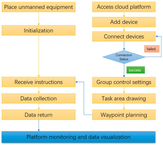 The basic flowchart of the experiment is shown in Figure 15. Firstly, the operator places the unmanned devices in designated positions. The tester accesses the platform web page through a browser to perform basic operations such as adding devices and group control settings. Next, the tester draws the mission area and sends the mission information to the unmanned devices. The devices autonomously explore the mission area based on the planned waypoints. Finally, the collected environmental data are transmitted to the platform and displayed on the web interface.