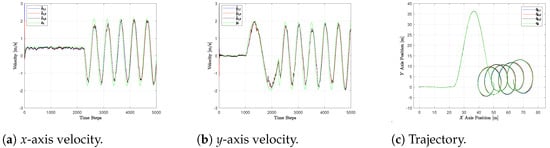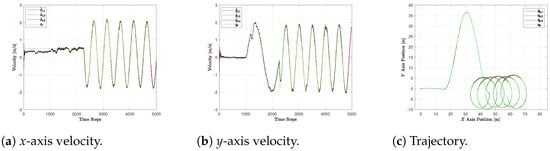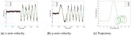Through and and the inverse of Equation (4), each agent can compute a local estimate of the target state. Then, the estimated planar positions and velocities of the target can be employed by the target following term in Equation (2) of the flocking protocol. By doing so, each agent tracks the estimated state of the target, rather than the true one. According to [], the estimation of this decentralized Kalman filter is capable of producing the same estimates locally that a centralized filter would give, provided that all agents communicate through a fully connected topology.
