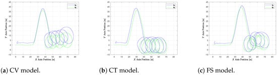 The CT model assumes a nearly constant turn rate of the target, so that its motion displays an almost zero tangential acceleration and a nearly constant normal acceleration []. If the turn rate is known, the model is linear and the corresponding prediction step is still given by Equation (5), with