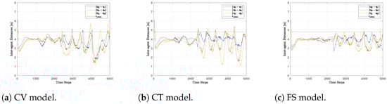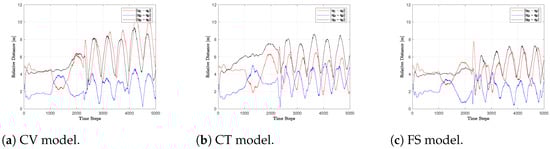 The different performances of the estimation process influence the flocking behavior. Indeed, the two tasks are executed in cascade, and the target tracking term in Equation (2) follows the estimates provided by the filter. In Figure 5, Figure 6 and Figure 7, it is possible to analyze this influence. In particular, in Figure 5, the actual trajectories of the target and the agents are presented. For clarity of the pictures, only agent 1 is considered. Figure 6 displays the relative distances between the target and the three UAVs in the swarm, while Figure 7 showcases the inter-agent distances between the three agents, for each described model. Looking at the trajectory of agent 1 in Figure 5, it is possible to see that, overall, the three models can make the UAVs correctly and timely follow the target. Some more in-depth differences may be noticed in Figure 6 and Figure 7. During the linear phase, the three models provide more or less the same flocking behavior. The desired inter-agent distance of 4 m is reached in all cases with a satisfactory transient and is kept almost constant. However, when the sinusoidal part takes place, an oscillatory behavior emerges. This is because, in the proximity of the target, the flocking protocol has an adaptive gain as in Equation (3), so that the reduced attractive force makes the agents less prompt in following the target. However, this distance is kept reasonably small and this behavior may be adjusted through parameter for a prompter formation. The FS provides the smoothest transient, while the CV and CT models act similarly. This can be clearly seen in Figure 7, where the inter-agent distances remain almost constant also in the sinusoidal phase. Finally, when the circular motion starts, the CV model yields the highest oscillations both in Figure 6 and Figure 7. Instead, the CT provides lower oscillations, especially in terms of the target–agent distances. Finally, the FS model results in the lowest oscillations in both metrics. The better performance of the FS with respect to the CT is due to the noisier nature of the velocity estimates that it provides. Indeed, the actual velocity tracked by the agents through (2) ends up being smaller with the FS compared to the CT, resulting in lower oscillations.