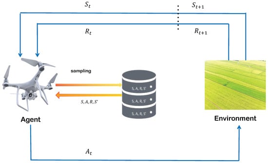 This diagram illustrates the workflow of an MDP where a drone (Agent) interacts with the environment. At time t, the drone is in state and takes action . The environment then responds with a new state and a reward . These data are stored and sampled to help improve the decision-making strategy of the drone.