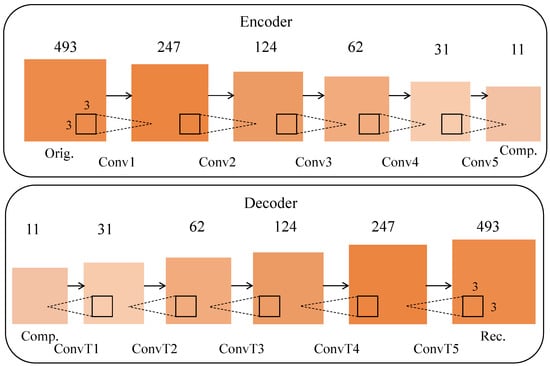 For the AE, it is divided into an encoder and a decoder. The 493 × 493 images are compressed into an 11 × 11 matrix through multiple convolutions by the encoder and then magnified back to the original image size by the decoder in a symmetric inverse process, known as reconstruction. By optimizing the mean squared error (MSE) between the reconstructed and original images, the AE network parameters are adjusted until the reconstruction image closely matches the original image.