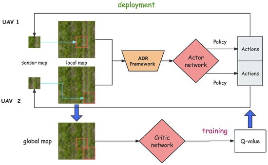 As illustrated in Figure 4, the overall architecture is designed to facilitate cooperative behavior among UAVs by combining dimensionality reduction and reinforcement learning. Each UAV collects sensor data from its environment, generating a sensor map which is then processed into a local map. To ensure computational efficiency, the ADR framework is applied to these local maps, performing dimensionality reduction and extracting relevant features from the high-dimensional image data. After this step, the reduced information is passed into the actor network, where a policy is generated to guide each UAV’s actions. These actions are performed during the deployment phase, allowing the UAVs to make decisions independently based on their local observations.