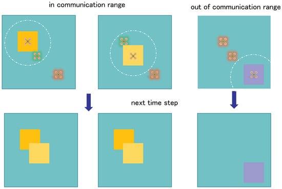 Illustration of the internal communication of the UAV. The UAVs interact with each other about their current measurements (shown here as orange, yellow, and purple rectangles). They must be within the communication range to interact, and the range is drawn in white circles in the figure. The green background represents in range, and the red represents out of range.