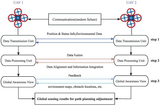 The communication module enables UAVs to exchange position, status, and environmental data for collaboration. The data transmission unit (step 1) sends this information to nearby UAVs, which is then processed in the data processing unit (step 2). The data are fused and aligned, providing a global awareness view (step 3), which includes environment maps and obstacle locations. The integrated global sensing results are used to adjust each UAV’s path planning.