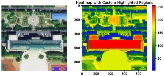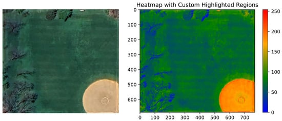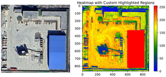 To verify that drones can efficiently collaborate in different scenarios, we conducted experiments in three distinct environments. These scenarios are as follows: Scenario 1—a strip area occupying a certain percentage of the space, Scenario 2—a rectangular area located in the corner of the scene, and Scenario 3—a strip area in the middle. The images of Scenarios 1, 2, and 3 are presented in Figure 8, Figure 9 and Figure 10, respectively. We identified real terrains matching these shapes and created heatmaps based on the areas of interest. In these heatmaps, the dark (especially red) parts are recognized as areas of high interest. During the mission, drones need to collect as much information as possible from these high-interest areas.