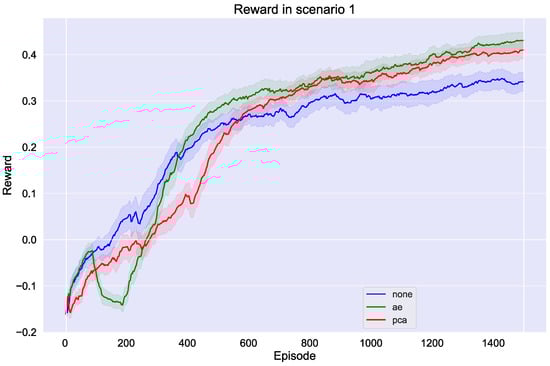 In the multi-agent reinforcement learning task of Scenario 1, different dimensionality reduction strategies have a significant impact on model performance, and the reward trend is presented in Figure 11. Overall, the AE strategy performed the best throughout the training process, ultimately achieving the highest reward value of approximately 0.45, demonstrating strong stability and learning effectiveness. At the beginning of training, the PCA (red line) method slightly outperforms both AE (green line) and the method without dimensionality reduction (blue line), suggesting that PCA has certain advantages in the initial exploration of strategies. However, the slightly fluctuating performance of AE may be attributed to the fact that the dimensionality reduction process introduces additional complexity, requiring more time to adapt to the environment.