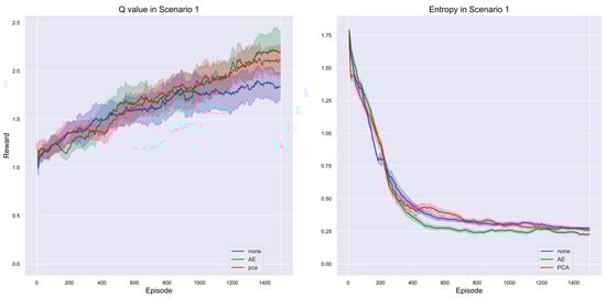 From the Q-value graph in Figure 16, it is evident that the AE performed exceptionally well during the early stages of training, quickly raising the Q-values and demonstrating its ability to extract key features and optimize strategy quality in the initial phase. However, as training progressed, PCA gradually caught up with the AE and showed greater stability in the later stages, eventually slightly surpassing the AE. This further confirms that in complex scenarios, PCA is better able to extract diverse features and enhance strategy quality over longer training periods.