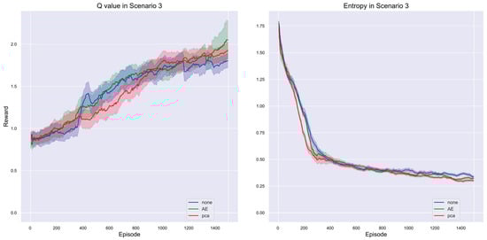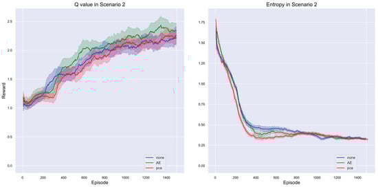 In the Q-value performance of Scenario 1, as shown in Figure 12, the PCA method (red line) performs the best in the later stages of training, with a final Q-value close to 2.0, showing its advantage in long-term strategy optimization. The AE (green line) has the next best performance, with a Q-value stabilized at around 1.8. The dimensionalized method (blue line), on the other hand, although performing moderately well in the early stages, has a lower final Q value that stays at around 1.5, slightly inferior to the other two dimensionalized strategies. We can see that in the later stages of training, the AE (green line) approach ends up with the lowest entropy value of the three, converging to 0.2. This suggests that the strategies with dimensionality reduction using AE exhibit the highest level of determinism, i.e., a more focused and stable choice of strategies. In contrast, the final entropy values of the PCA (red line) and no dimensionality reduction (blue line) methods are slightly higher, approaching 0.25, implying that their strategies are slightly less deterministic and still retain a degree of exploratory or uncertainty. Therefore, AE not only exhibits a better reward value on the results of training but also possesses a higher strategy certainty, indicating that AE can capture and utilize the key features in the scene more efficiently, helping the intelligence to converge to the optimal strategy faster and more stably.