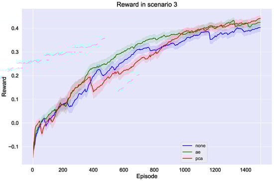 In the third scenario, as illustrated in Figure 15 regarding rewards, although PCA ultimately slightly surpassed the AE, it is important to note that the AE consistently led during the early stages of training. Specifically, the AE maintained higher reward values throughout the early and middle stages of training compared to PCA and the no-dimensionality-reduction method (None), indicating that the AE was able to extract effective features more quickly and enhance strategy quality at a faster rate. However, as training progressed, PCA gradually caught up and slightly outperformed the AE in the later stages. This shift may be attributed to the ability of PCA to better manage various features as the complexity of the scenario increases, thereby improving overall model performance. Nonetheless, the AE exhibited strong performance throughout most of the training, demonstrating its advantage in handling complex data during the initial phases. Overall, while PCA held a slight edge in final performance, the AE performed exceptionally well across the entire training process, particularly in the early stages, with faster convergence and greater stability. This suggests that different dimensionality reduction methods may offer distinct advantages at various stages of training, and the final choice should take into account the specific application scenario and model requirements.