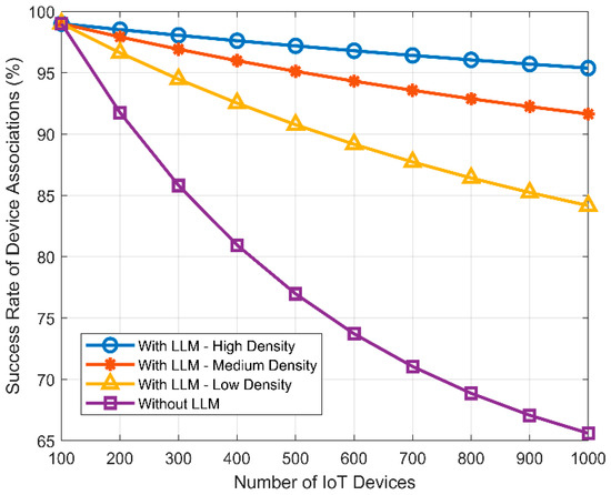 Figure 5 clearly illustrates the success rate of device associations in IoT networks with varying densities, highlighting the benefits of using LLMs. The figure also shows that networks managed with LLMs consistently maintain higher success rates across all densities, compared to the network without an LLM, which experiences a sharp decline in success as the number of IoT devices increases. The use of distinct colors and markers effectively differentiates the scenarios, demonstrating that LLMs significantly enhance network scalability and efficiency.