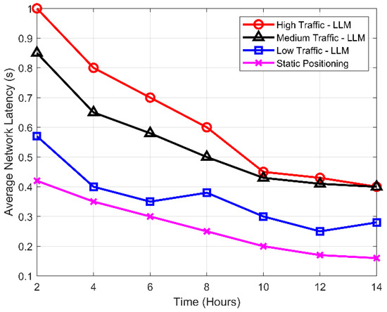 Figure 6 illustrates the average network latency over time for different traffic conditions managed by LLMs and compares these with static positioning. The different lines show that latency decreases significantly under LLM management as time progresses. In contrast, the pink line representing static positioning demonstrates higher and relatively constant latency. This figure effectively highlights the advantages of adaptive LLM management in reducing latency, especially in higher traffic scenarios, suggesting superior dynamic network optimization compared to static methods.