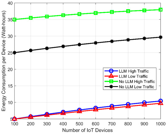 Figure 7 illustrates the energy consumption per IoT device as a function of the number of devices, comparing scenarios with and without the use of LLMs under different traffic conditions. The green and black lines, representing scenarios without LLMs in both high and low traffic, respectively, show higher energy consumption compared to the red and blue lines, which depict significantly lower energy usage with LLM management in high- and low-traffic scenarios.